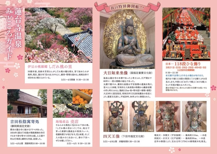 伊豆下田の桃源郷に春爛漫の季節が訪れ、蓮台寺温泉で「しだれ桃の里まつり」が開催されます。今年も「日本一118段のひな飾り」が日にち限定登場。国の重要文化財「大日如来坐像」と、県史跡文化財「吉田松陰寓寄処」も公開します。